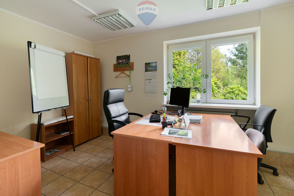 W lewej części budynku, na piętrze sala biurowa (26 m2) i gabinety