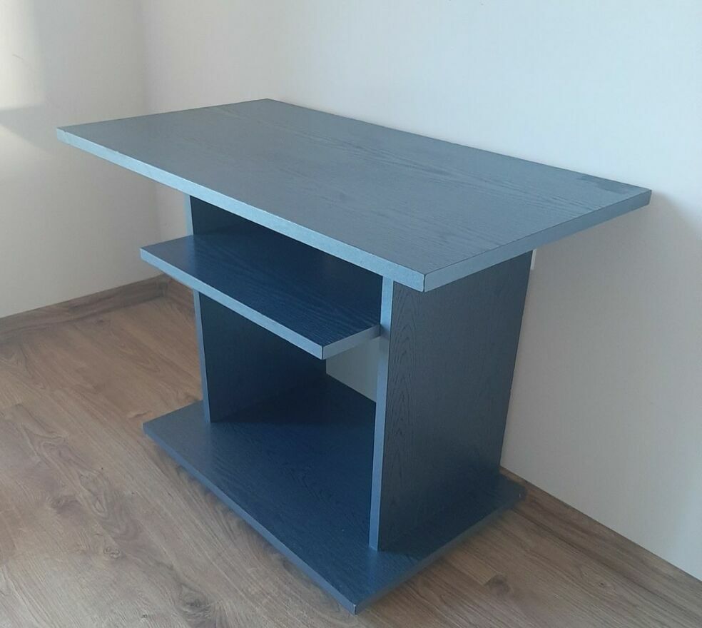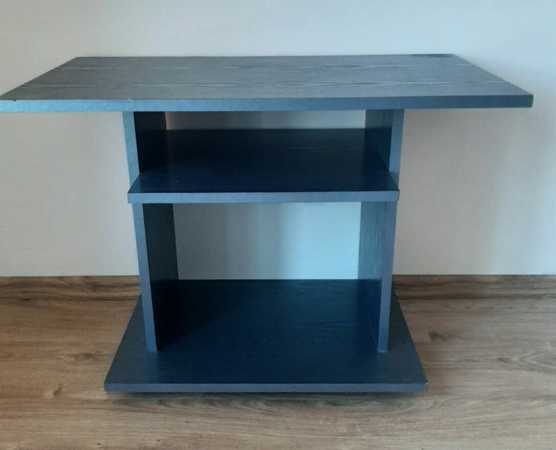 Solidny stolik w kolorze szarym, który może służyć jako podstawa pod telewizor lub drukarkę. Posiada dwie półki, zapewniając dodatkową przestrzeń do przechowywania. Mebel jest używany, ale w dobrym stanie. Może być przydatnym dodatkiem do Twojego domu lub biura. Wymiary 80x43x60cm na kółkach.Sławek